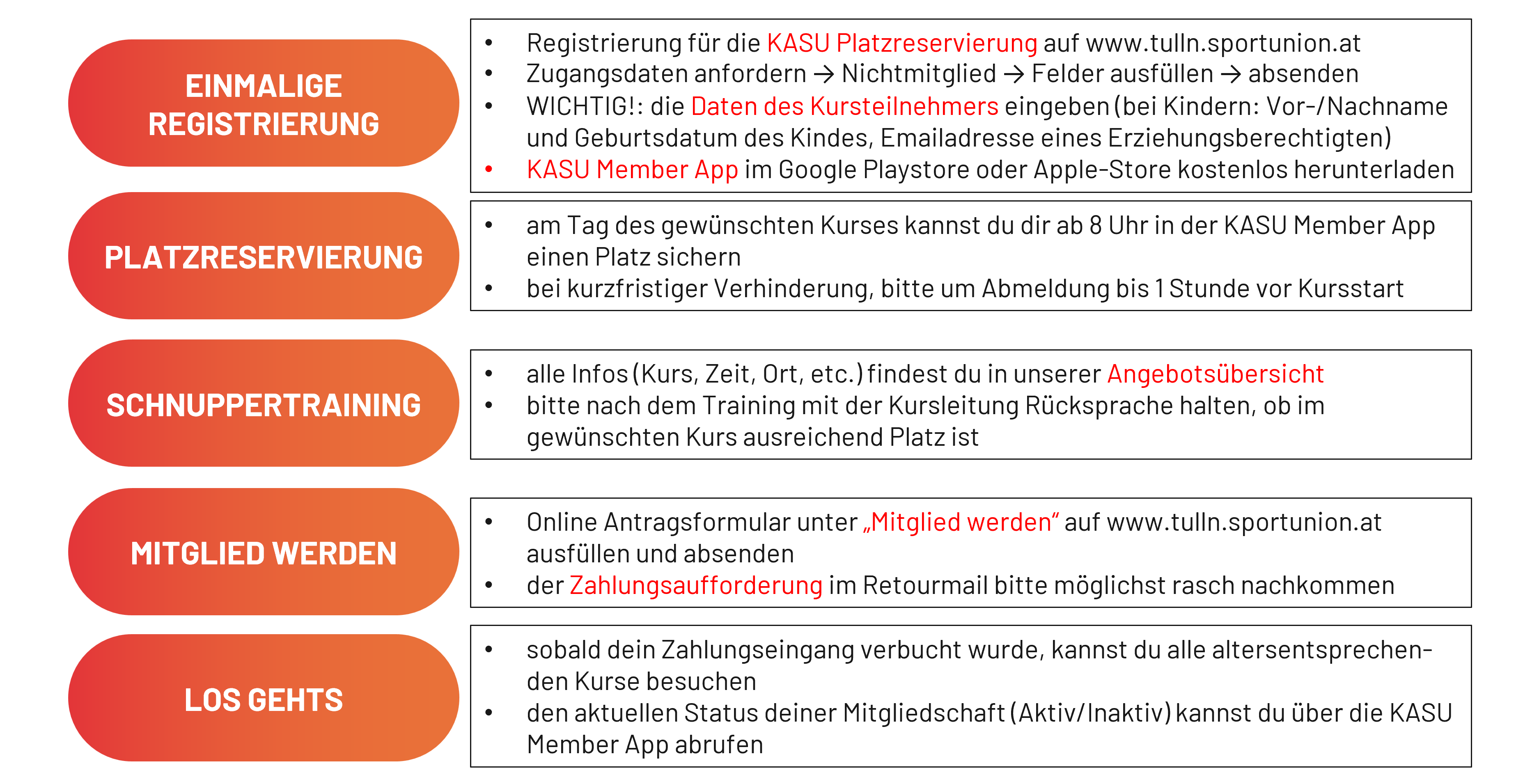 Bitte immer am Tag des Kurses via Kasu Member App für den jeweiligen Kurs anmelden! Dies gilt für Mitglieder und Schnupperer!